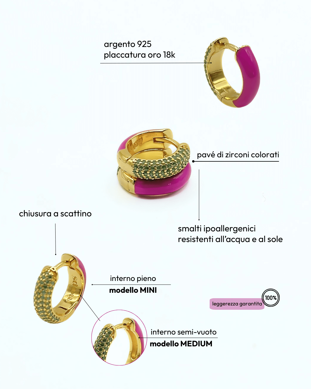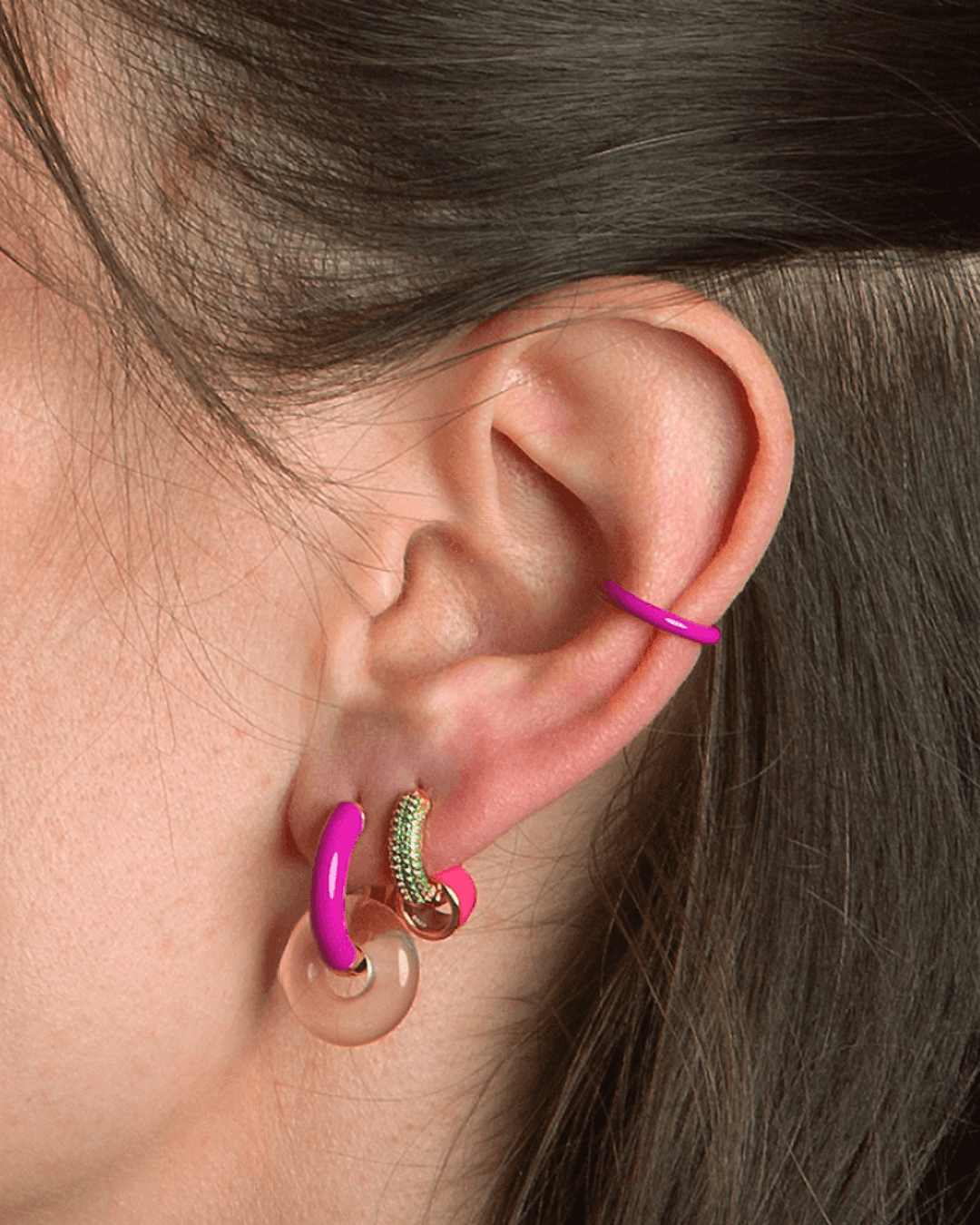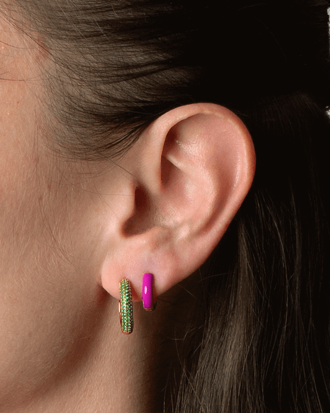 Con un lato smaltato viola berry e l'altro arricchito con zirconi verde smeraldo, questo orecchino a cerchio è l'ideale per aggiungere un tocco di intensità al tuo look.