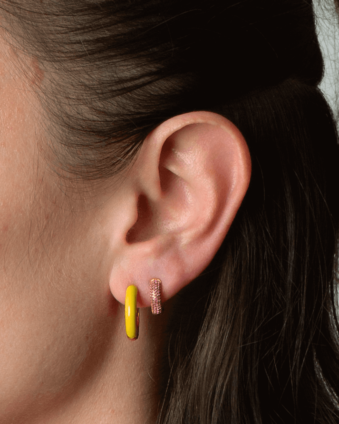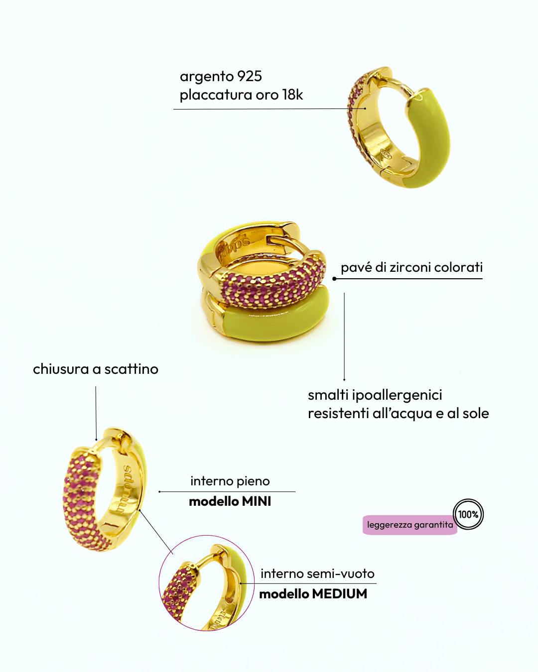 L'Hoop Gems Lemon è per chi ama i toni vivaci. Realizzati in argento 925 placcato oro 18K, questi orecchini a cerchio presentano un lato smaltato giallo lemon e l'altro arricchito con zirconi rosso rubino, creando un mix di colori intenso e audace.