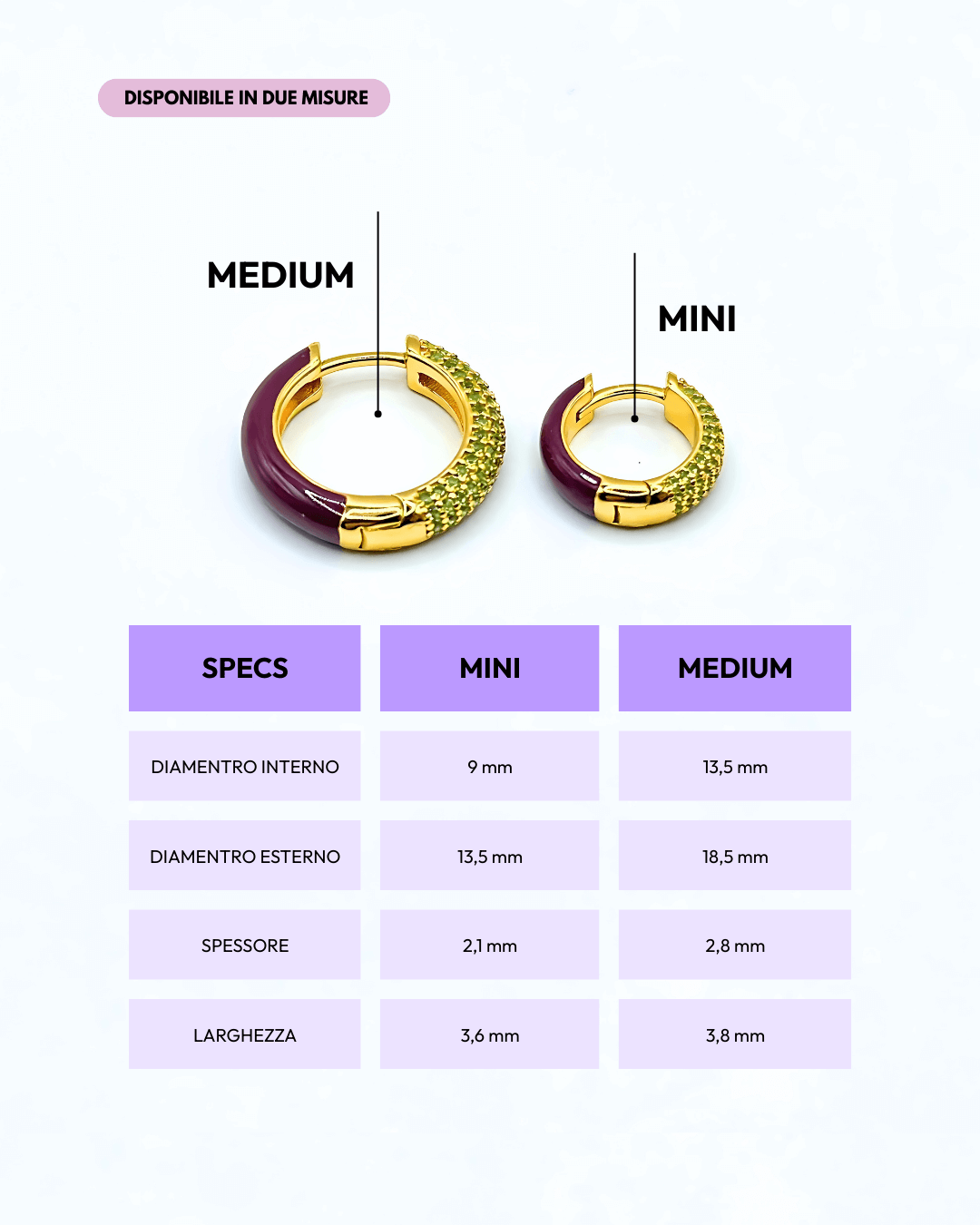 L'Hoop Gems Plum (Winter Edition) è per chi ama i toni intensi e sofisticati. Realizzati in argento 925 placcato oro 18K, questi orecchini a cerchio presentano un lato smaltato viola prugna plum e l'altro arricchito con zirconi apple green, creando una combinazione perfetta di colori audaci e luminosi.