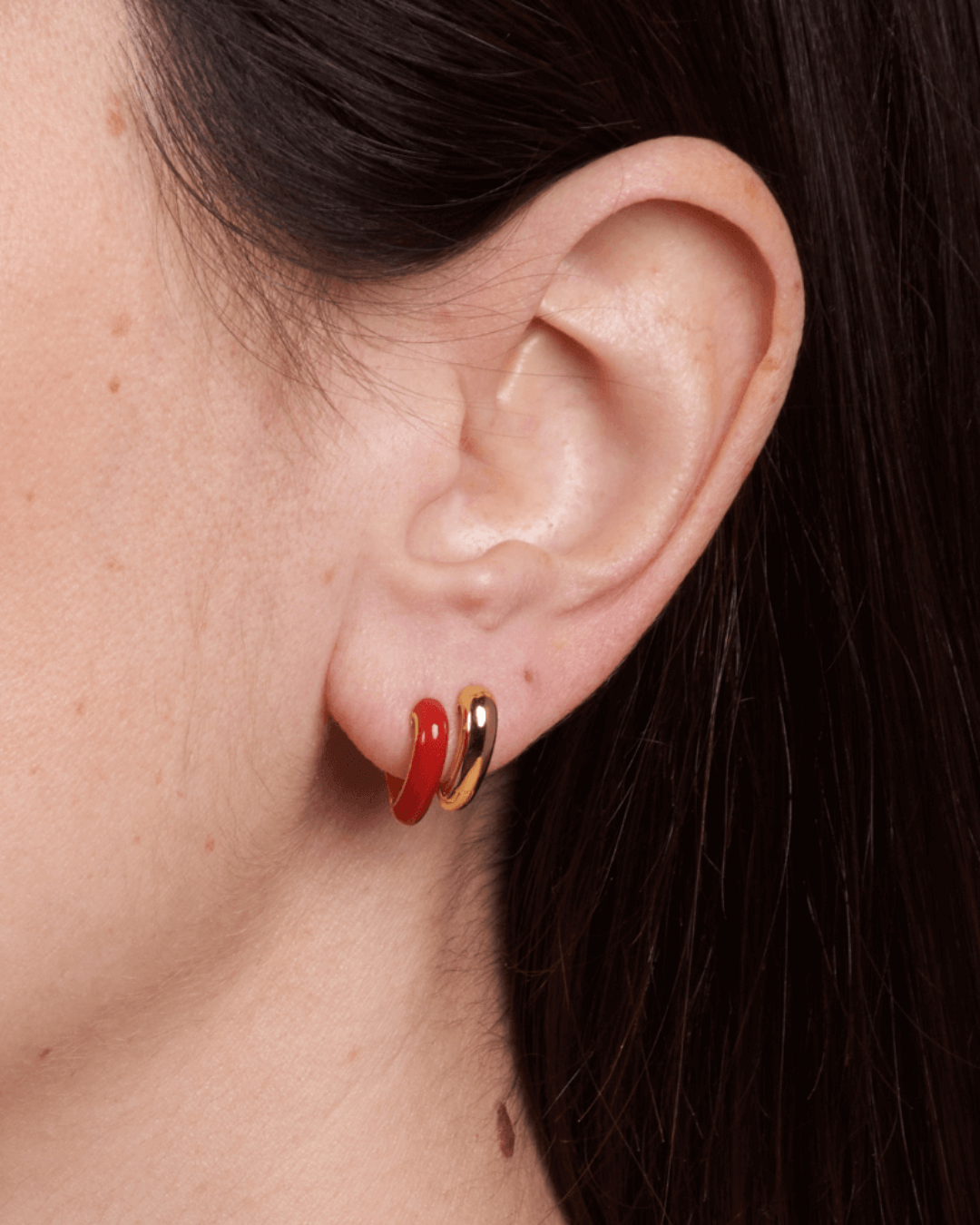 Hoop double-face a forma di cuore, un lato smaltato rosso ciliegia, l'altro placcato in oro giallo 18K.