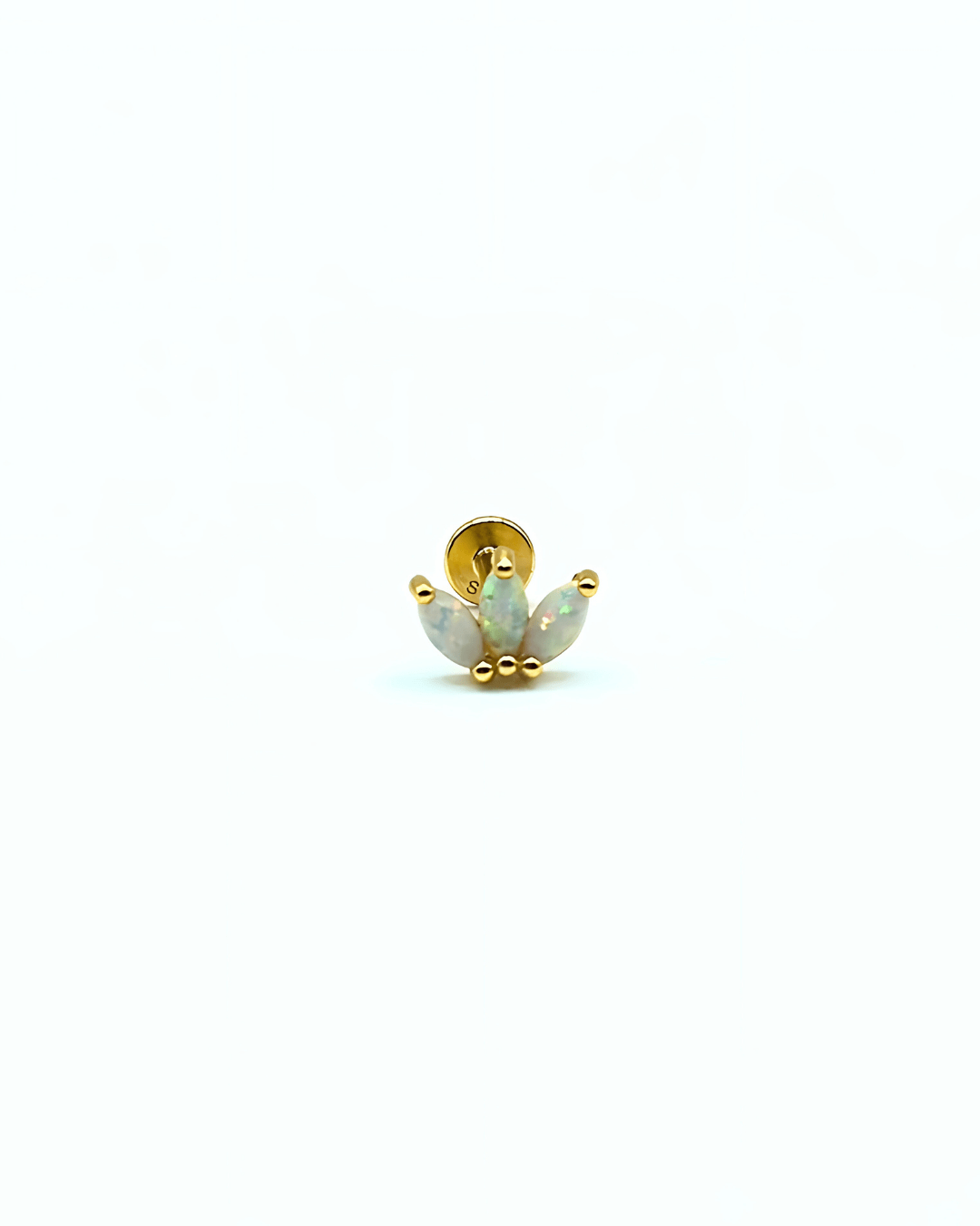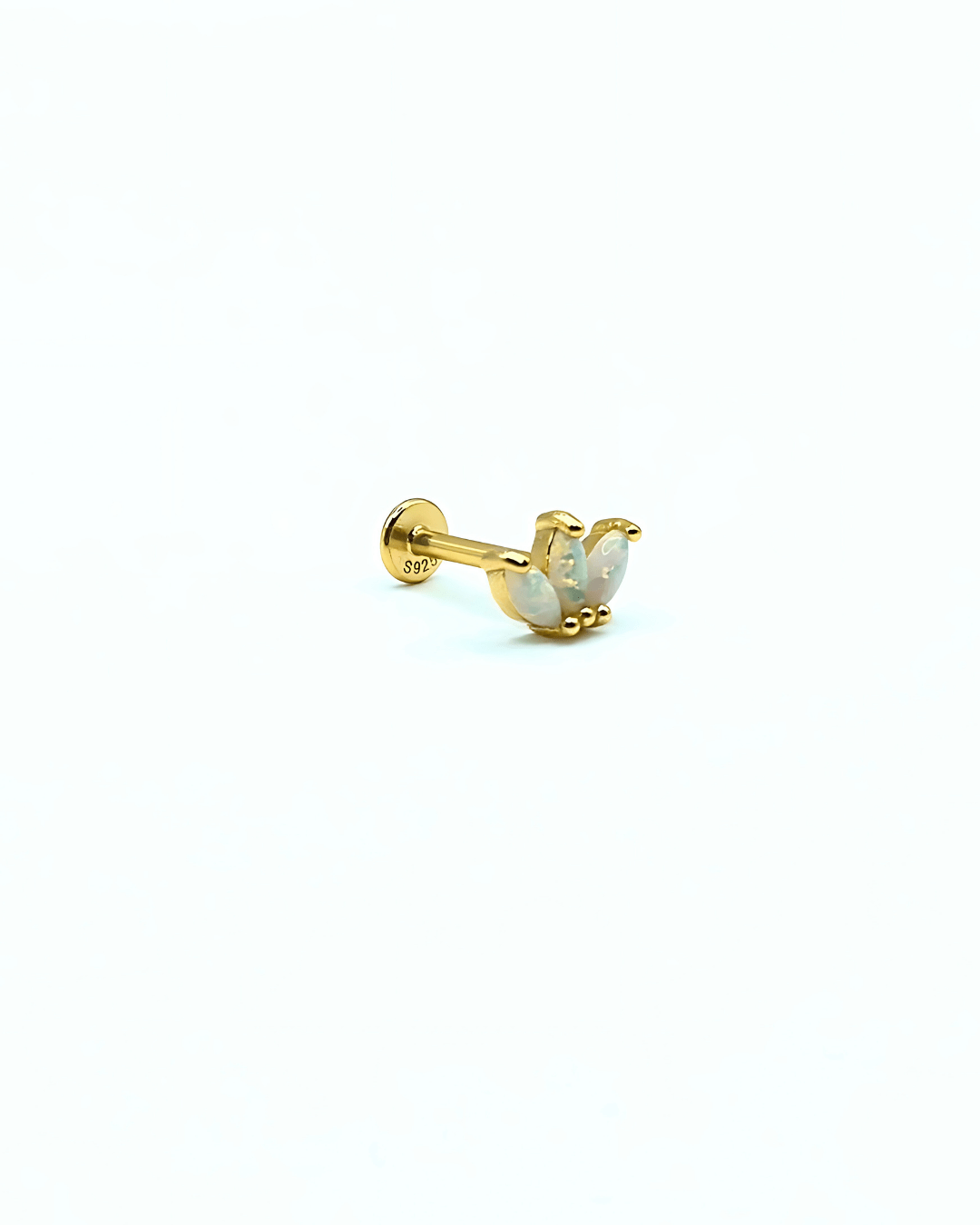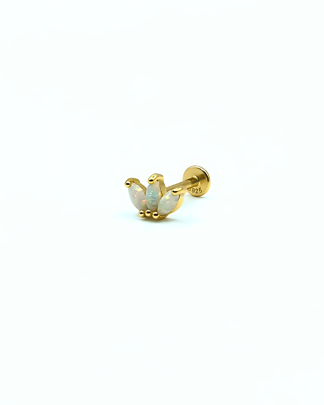 L'Opal Glimmer, parte della Opal Series di MOOPS®, è un piercing sofisticato e audace. Presenta tre opali taglio marquise che creano un ventaglio scintillante. Realizzato in argento 925 placcato oro 18K, questo design accattivante è ideale per chi cerca uno stile che cattura l’attenzione. La barra da 8 mm e calibro 1,2 mm offre una vestibilità comoda e stabile grazie al design flatback.