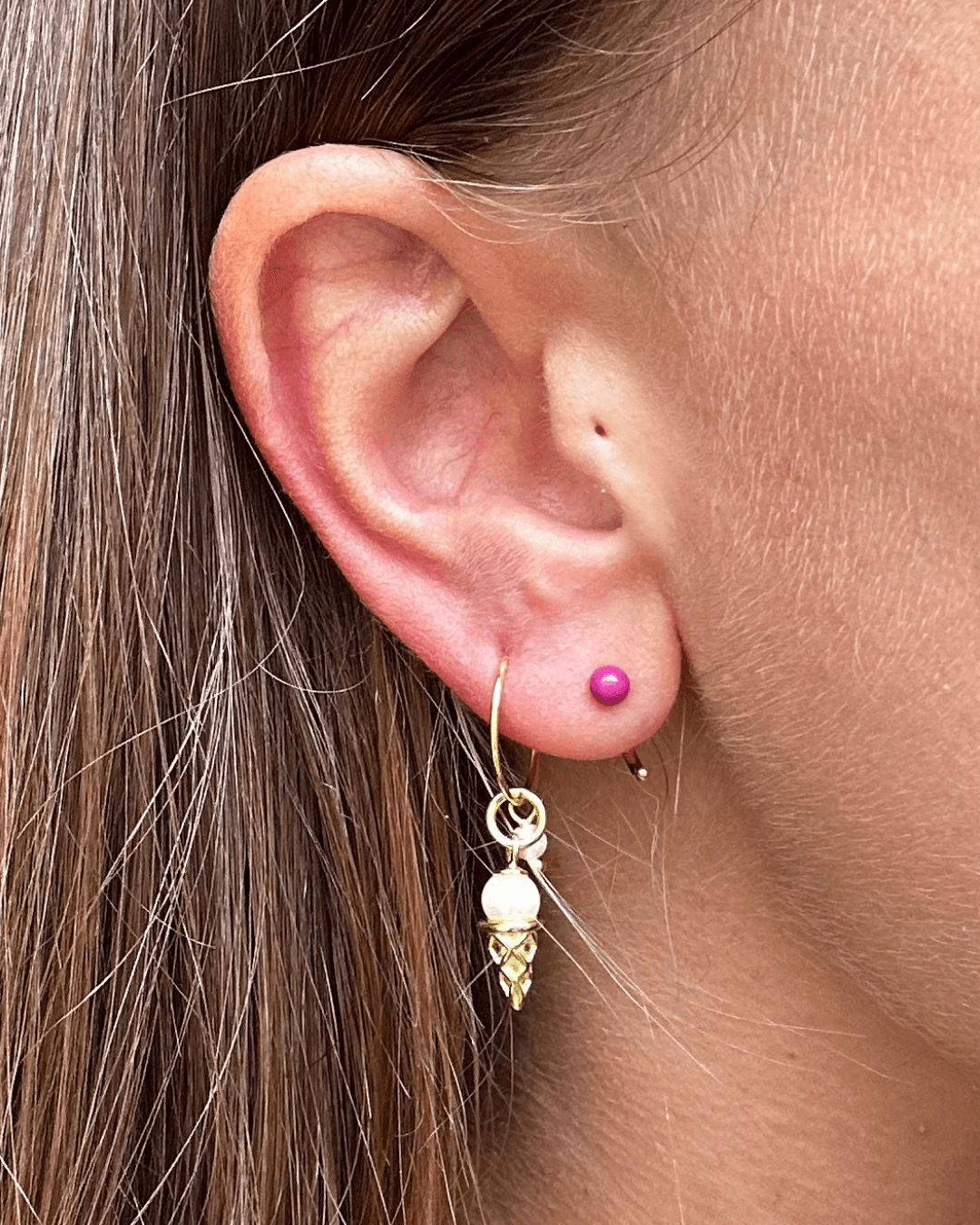 Il LOOP BALL – Berry accende l’orecchio con una sfera smaltata fucsia/berry: piccolo, brillante, con quell’energia che rende tutto più vivo. È il dettaglio “goloso” della collezione SCOOPS.
