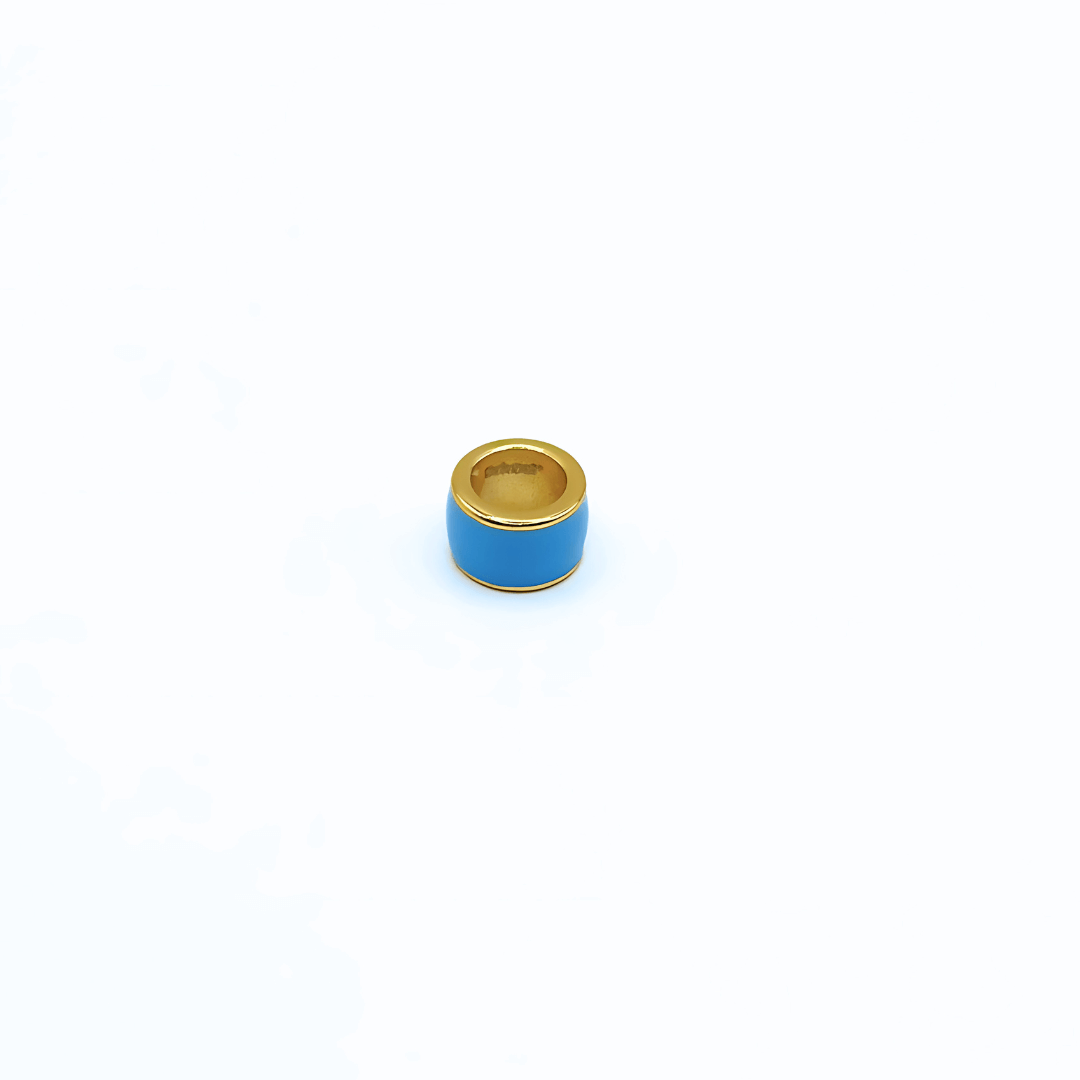 Charm cilindro smaltato azzurro: fresco, “viso riposato” in un gesto. Sta bene con denim, bianco e mix oro&argento.